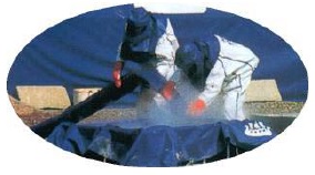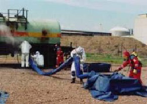 Материал, из которого сделан комплект, проверен на соответствие Европейским нормам. Сжиженный под давлением газ (СДЯВ) высвобождается из цистерны в виде сильно охлажденного аэрозоля. На расстоянии 7-8 метров от цистерны устанавливается бассейн, в который опускается один конец развернутого рукава, а другой с воронкой протянут к цистерне.