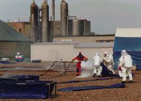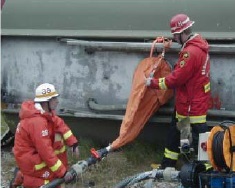В последнее время, как свидетельствует статистика, постоянно увеличивается количество сообщений об авариях с утечками в различных резервуарах со сжиженными газами под давлением (NH3, Cl2, SO2 и др.). Спасателям приходится работать в экстремальных условиях, и они подвергаются очень высоким физическим и психологическим нагрузкам. Для места утечки типичны низкие температуры от -50 до -75°C и высокое давление. Одновременно может возникнуть опасность воспламенения вытекших веществ или окружающей воздушной смеси. Например, взрывоопасной и легковоспламеняющейся является смесь, содержащая 15–28% аммиака в воздухе. Вероятное давление составляет между 0,7 и 0,8 МПа. Спасательное оборудование должно выдерживать указанные величины влияющих факторов. Для быстрого и надежного проведения спасательных работ условия безопасности требуют использования проверенного и сертифицированного в ЕC оборудования и амуниции из специальных материалов (так называемые испытания на соответствие нормам ЕС). Кроме того, параллельно с этими требованиями в Германии еще проводятся отдельные испытания на устойчивость к химикатам, концентрация которых на 50% превышает утвержденные в Германии нормы. Особое значение имеют средства индивидуальной защиты. Достойны упоминания химические костюмы, устойчивые к влиянию низкой температуры от -80 °C и одновременно к воздействию пламени с температурой до +1800°C в течение интервала времени до 5 секунд, а также теплоотражательные костюмы. На сегодняшний день оба типа костюмов имеют превосходные защитные качества в сочетании с достаточной прочностью при использовании (ношении). Для сбора сильно охлажденных аэрозолей из разгерметизированных емкостей концепция безопасности рекомендует метод обратного сжижения (реконденсации). При этом используется комплект для реконденсации.