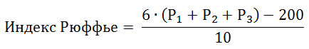 Индекс Рюффье. Для оценки деятельности сердечно-сосудистой системы можно пользоваться пробой Рюффье. После 5-минутного спокойного состояния в положении сидя подсчитать пульс за 10с (Р1), затем в течение 45 с выполнить 30 приседаний. Сразу после приседаний подсчитать пульс за первые 10 с (Р2) и через минуту (РЗ) после нагрузки. Результаты оцениваются по индексу, который определяется по формуле: