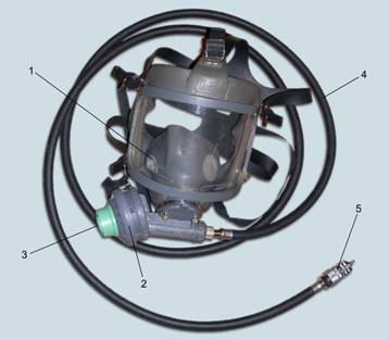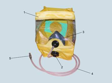 1 капюшон, 2 клапан выдоха, 3 полумаска, 4 воздухоподающий шланг, 5 штуцер с дюзой для подключения к дыхательному аппарату