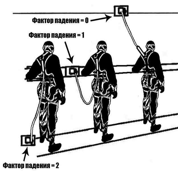 Фактор падения – это характеристика высоты возможного падения работника определяемая отношением значения высоты падения работника до начала срабатывания амортизатора к суммарной длине соединительных элементов страховочной системы. Значение фактора падения зависит от места выбора анкерного устройства и суммарной длины соединительных элементов страховочной системы. Предпочтительным является выбор места анкерного устройства над головой работающего, т.е. выше точки прикрепления соединительных элементов страховочной системы к его привязи. В этом случае фактор падения равен нулю.