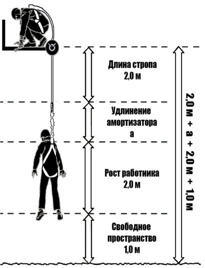 Запас высоты рассчитывается с учетом суммарной длины стропа и соединителей, с учетом длины сработавшего амортизатора, роста работника, а также свободного пространства, остающегося до нижележащей поверхности в состоянии равновесия работника после остановки падения. Расчет запаса высоты при использовании горизонтальной анкерной линии должен учитывать ее геометрию (возможное провисание). В случае если свободное пространство менее 0.5 м должны использоваться вертикальная анкерная жесткая линия.