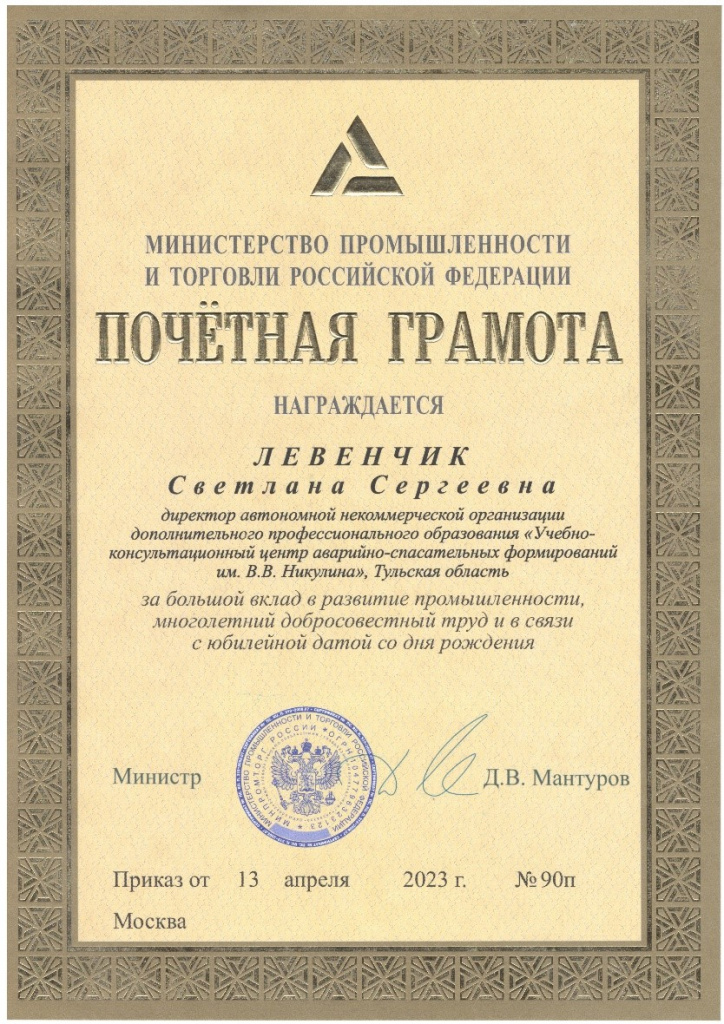 В рамках заседания Отраслевой комиссии Минпромторга России по аттестации в химической промышленности аварийно-спасательных служб, аварийно-спасательных формирований, спасателей и граждан, приобретающих статус спасателя, 7 июня 2023 г., состоялось торжественное награждение Почетной грамотой Министерства промышленности и торговли Российской Федерации директора АНО ДПО «УКЦАСФ им. В.В. Никулина» Левенчик Светланы Сергеевны.